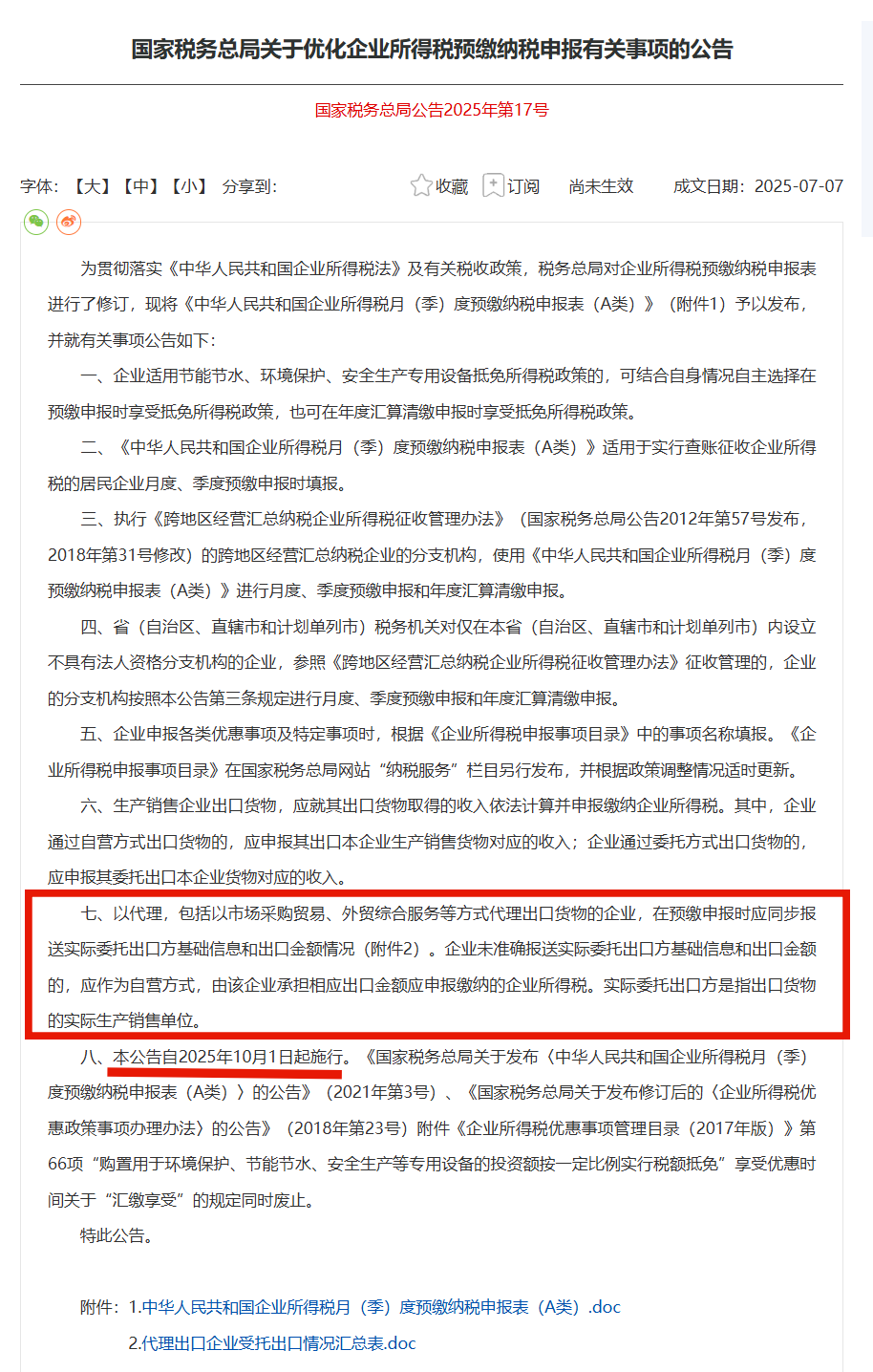 國家稅務(wù)總局發(fā)布公告,《國家稅務(wù)總局關(guān)于優(yōu)化企業(yè)所得稅預(yù)繳納稅申報(bào)有關(guān)事項(xiàng)的公告》簡稱17號(hào)公告,2025年10月1號(hào)起實(shí)施。對(duì)企業(yè)所得稅預(yù)繳納稅申報(bào)表進(jìn)行了修訂。